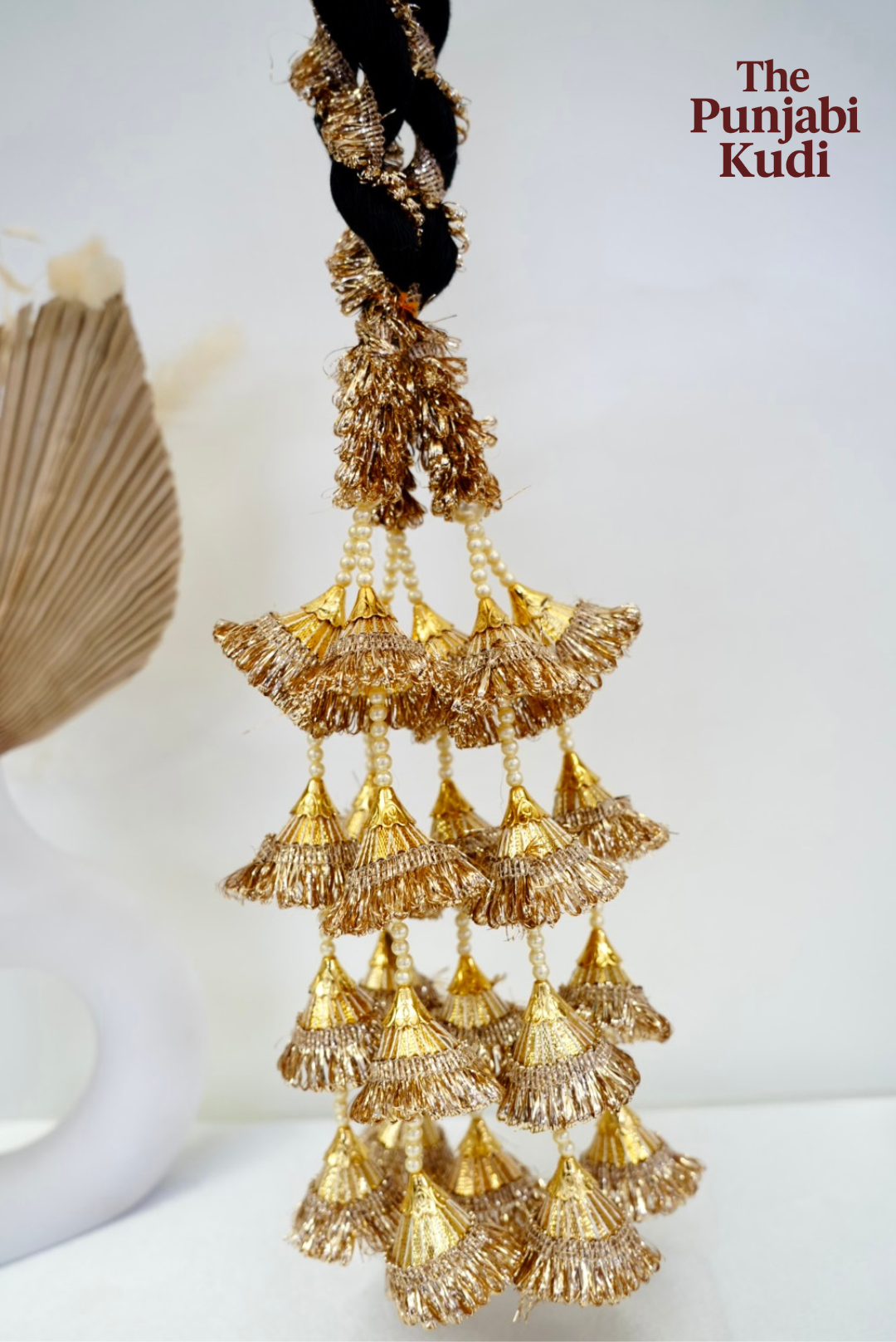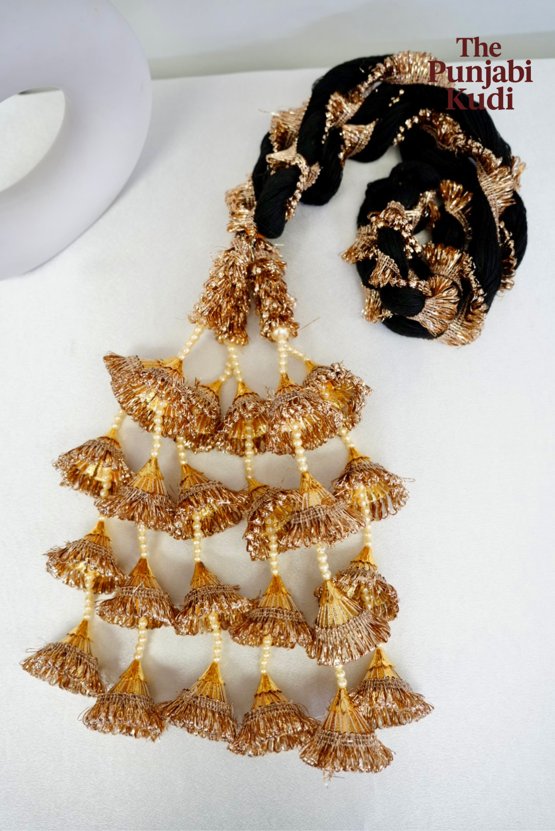 Turn every head with this dazzling Gold Tassel Charminar Pearl Paranda, expertly handcrafted to bring a touch of royal flair to your braid.