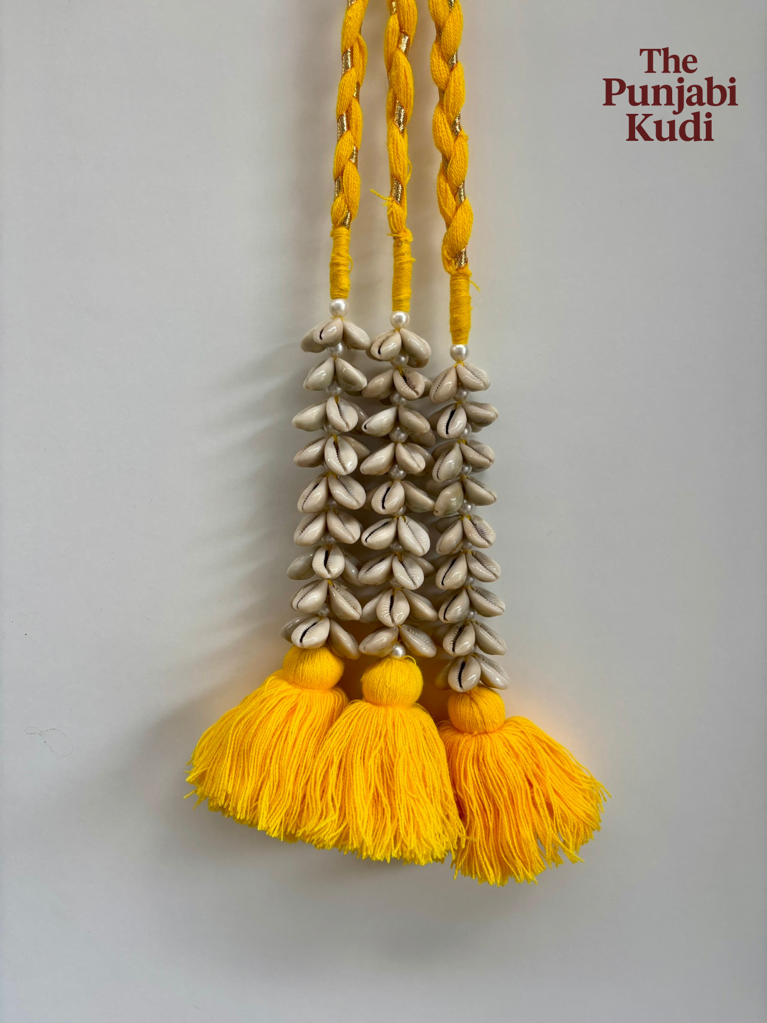 Celebrate Punjabi tradition with this stunning Shell Paranda, beautifully designed with handwoven braids, natural cowrie shells, and bold tassels.