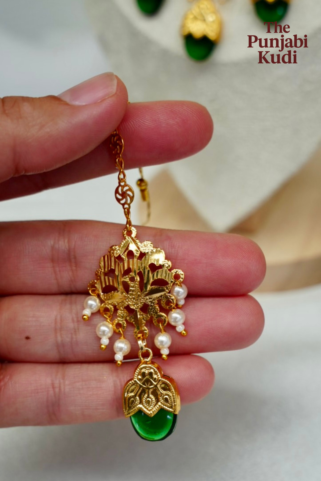 Punjabi Traditional Dakh Set with Tikka in Green Stones